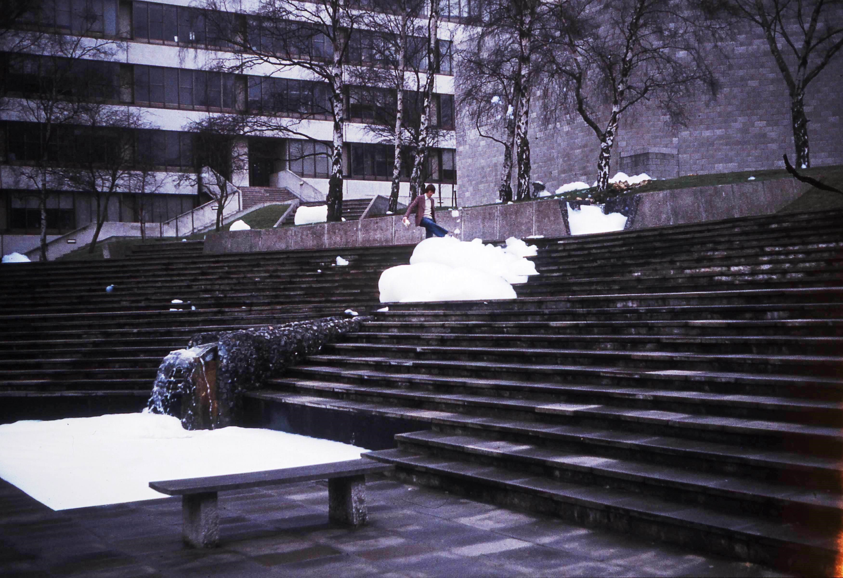 "I was one of the four CHE II guys that created the big froth at UEA in 1973. We used boxes of water softener, followed an hour later by potassium permanganate bought from chemists in Norwich to turn it pink and a few gallons of liquid detergent! It was carefully planned and the results stunned us all next morning when we entered the Square from Waveney Terrace. There was froth everywhere! Large boulders rolling around the Square, and even hanging in the trees. One student was having fun playing in the froth!"